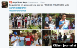 Los reporteros Juan G. Febles, Lázaro Yuri Valle, Agustín López y Serafín Morán, y la Dama de Blanco Eralides Frómeta fueron detenidos este domingo cuando se dirigían al parque Gandhi en Miramar, Ciudad Habana, donde habitualmente decenas de activistas de Derechos Humanos se dan cita para desarrollar la campaña #TodosMarchamos.