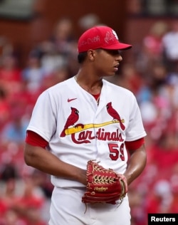 El lanzador abridor de los St. Louis @Cardinals Johan Oviedo (59) jugó con una gorra con el mensaje #SOSCuba y #PatriayVida durante la primera entrada contra los Cachorros de Chicago en el Busch Stadium.