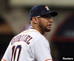 El primera base de los Astros de Houston, Yuli Gurriel (10) usó una gorra con el mensaje #SOSCuba en un juego contra los Indios de Cleveland en el Minute Maid Park, el 20 de julio de 2021; en Houston, Texas, Estados Unidos.